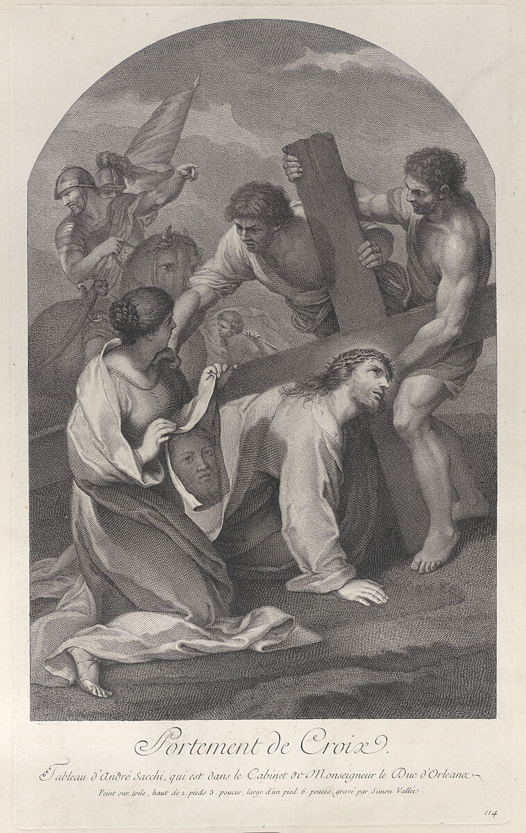 - Title: Christ fallen to the ground under the weight of the cross, with two men assisting and Saint Veronica kneeling with the veil at left