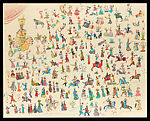 Iranian-American artist Ardeshir Mohassess was a celebrated satirist of contemporary life and politics in Iran. War and Peace is an exemplary work that combines many of the motifs and themes that he returned to consistently over the course of his career. At the same time, the work’s large size, incredible detail, and its rare and engaging use of color set it apart from the rest of the artist’s oeuvre. A figure at the upper left-hand corner dominates the scene. He appears in the guise of a Qajar king. In particular, his physical features, as well as his costume and pose are reminiscent of portraits of Shah Fath ‘Ali Shah Qajar (1769–1834). The Shah’s posthumous image combined a reputation for debauchery and the irresponsible pursuit of pleasure with his failures on the battlefield and the weakened state of the empire at the time of his death. As if to confirm this characterization of the Qajar king, the figures depicted in miniature across the work are engaged in either acts of courtly entertainment and debauchery or battle and bloodshed.