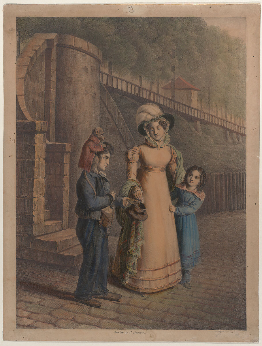 - Title:Boy with a monkey on his shoulder receiving coins from a mother and daughter