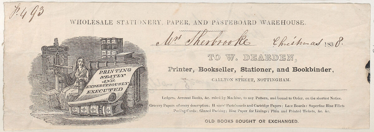 - Title: Trade Card for W. Dearden, Printer, Bookseller, Stationer, and Bookbinder