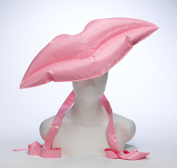 This whimsical headpiece by milliner Stephen Jones for John Galliano is a characteristic example of the creative alchemy between the designers who share a lighthearted, romantic aesthetic. Galliano's runway collection, inspired by the idea of adults playing a game of children's dress up was accessorized with Jones' inflatable designs. This example resembles a child's pool float, but also recalls 1960s Pop Art motifs and Dalí's Surrealist Mae West Lips sofa based his newspaper collage "Mae West's Face which may be used as a Surrealist Apartment" (1934-35). Its shape and scale convey an exaggerated sense of femininity and glamour.