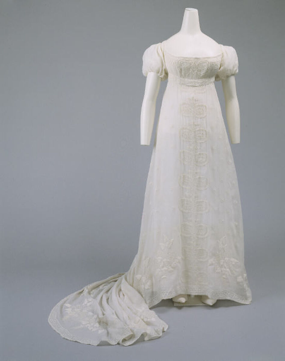 Just a decade after the French Directiore period and the year the Empire was established, this classic Empire silhouette would have been preferred by Empress Josephine. Most portraits of the empress show her in white, the color Napolean preferred her to wear. Ingres often painted women in white; in 1806 his vision in white of Mademoiselle Rivière appeared at the Salon.