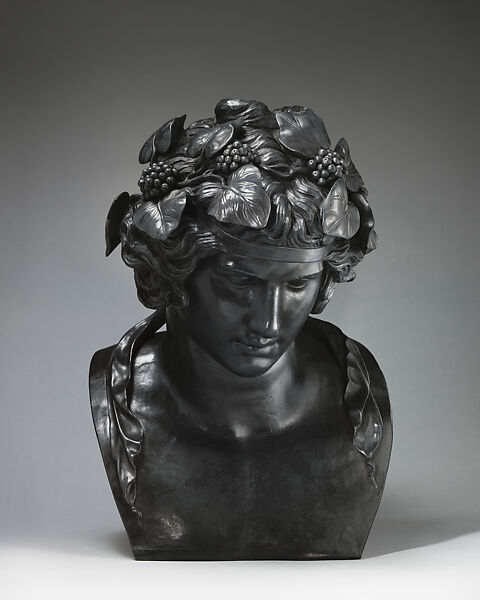 This monumental bust of Bacchus demonstrates Wedgwood’s exceptional skills in copying antique forms and modernizing them by using novel ceramic bodies such as black basalt. Probably intended to decorate a library, the bust is a copy of an ancient marble sculpture purchased by the earl of Shelburne in 1772. Once considered Emperor Hadrian’s lover Antinous, the bust is now thought to represent the ancient Roman god of wine and intoxication.