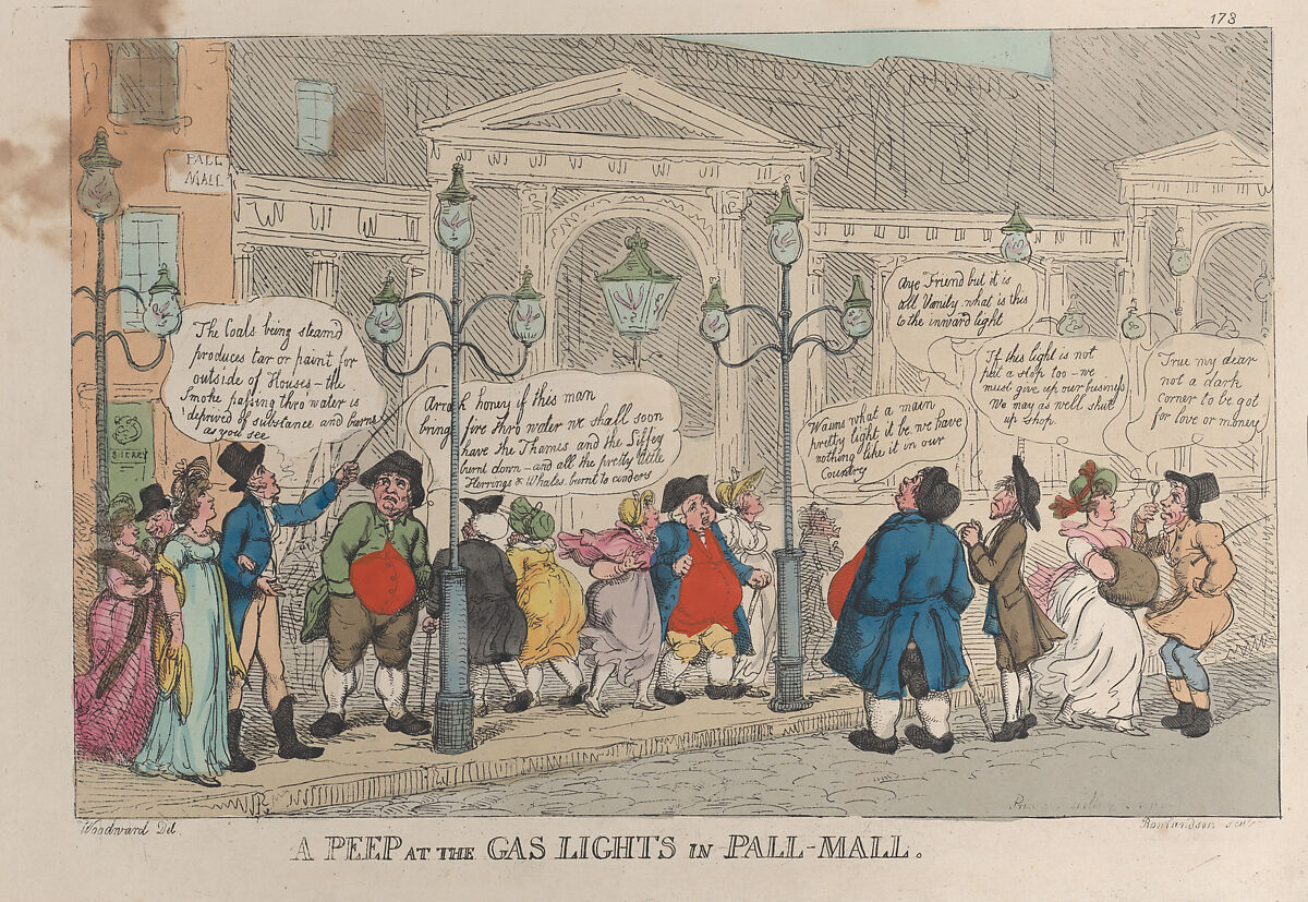 Men and women here walk along Pall Mall, amazed at the sight of a new type of lighting. In 1802 coal gas began to be used to light shops and factories. In 1807, a German called Winsor raised £50,000 to brighten Pall Mall in a speculation that failed. Triple flames, called cockspur lights, are seen here flickering infront of an elegant screen of columns that Nash built for the Prince Regent.