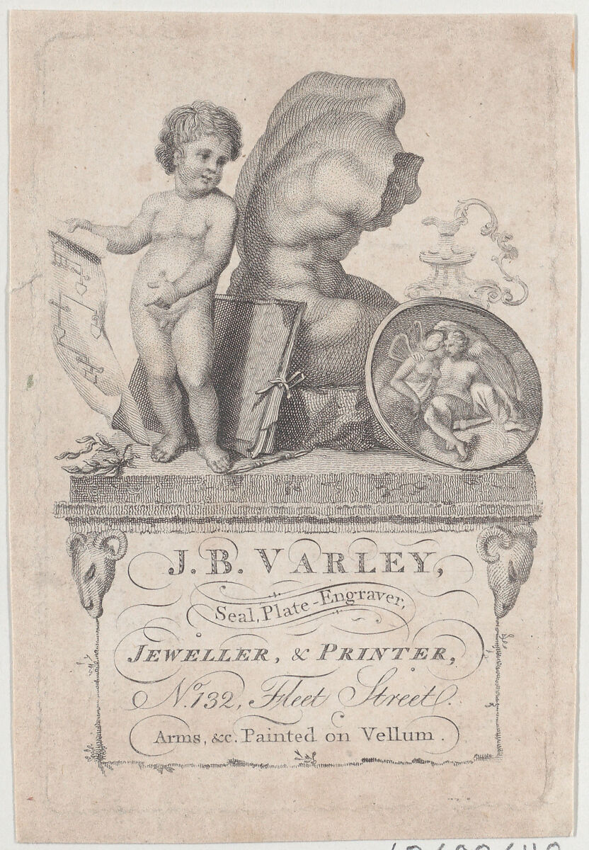 This object is housed in an album of British trade cards from the collections of Bella C. Landauer, Ambrose Heal, and others. The term “trade card” is of nineteenth-century origin and refers to a card that advertises the services of an individual or business. Eighteenth-century trade cards were often printed on thin sheets of paper and referred to as “tradesmen’s cards,” “tradesmen’s bills,” or “shopkeeper’s bills.” During the Victorian era, trade cards were often reinforced on pasteboard and closely resemble business cards today.