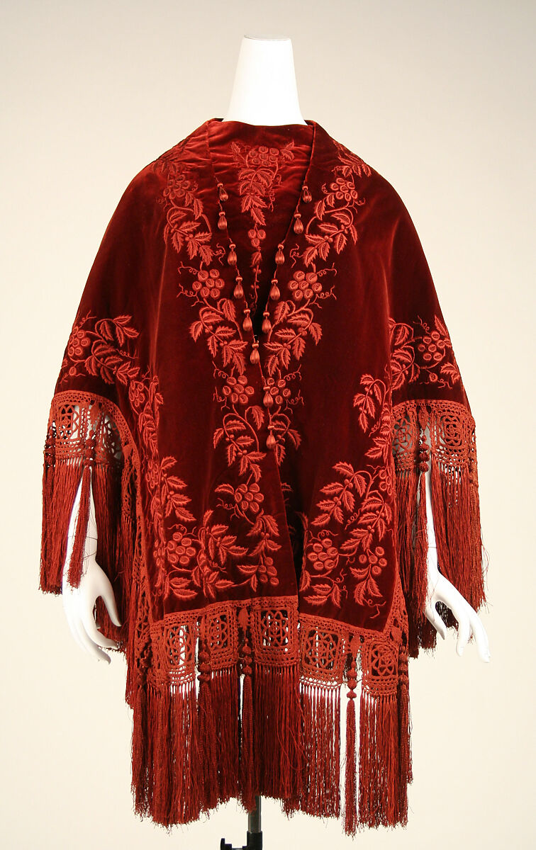 Nuts, berries, and leaves on a russet field are complemented by the drape of fringe, its fall also a reference to the season. All that one needs to hibernate for the winter is present on this shawl and even three-dimensionally. Not only is there sculptural relief inherent in the luxuriant velvet, but the front closures also resemble berries. A mantle for a human being is remarkably like fall's organic mantle.