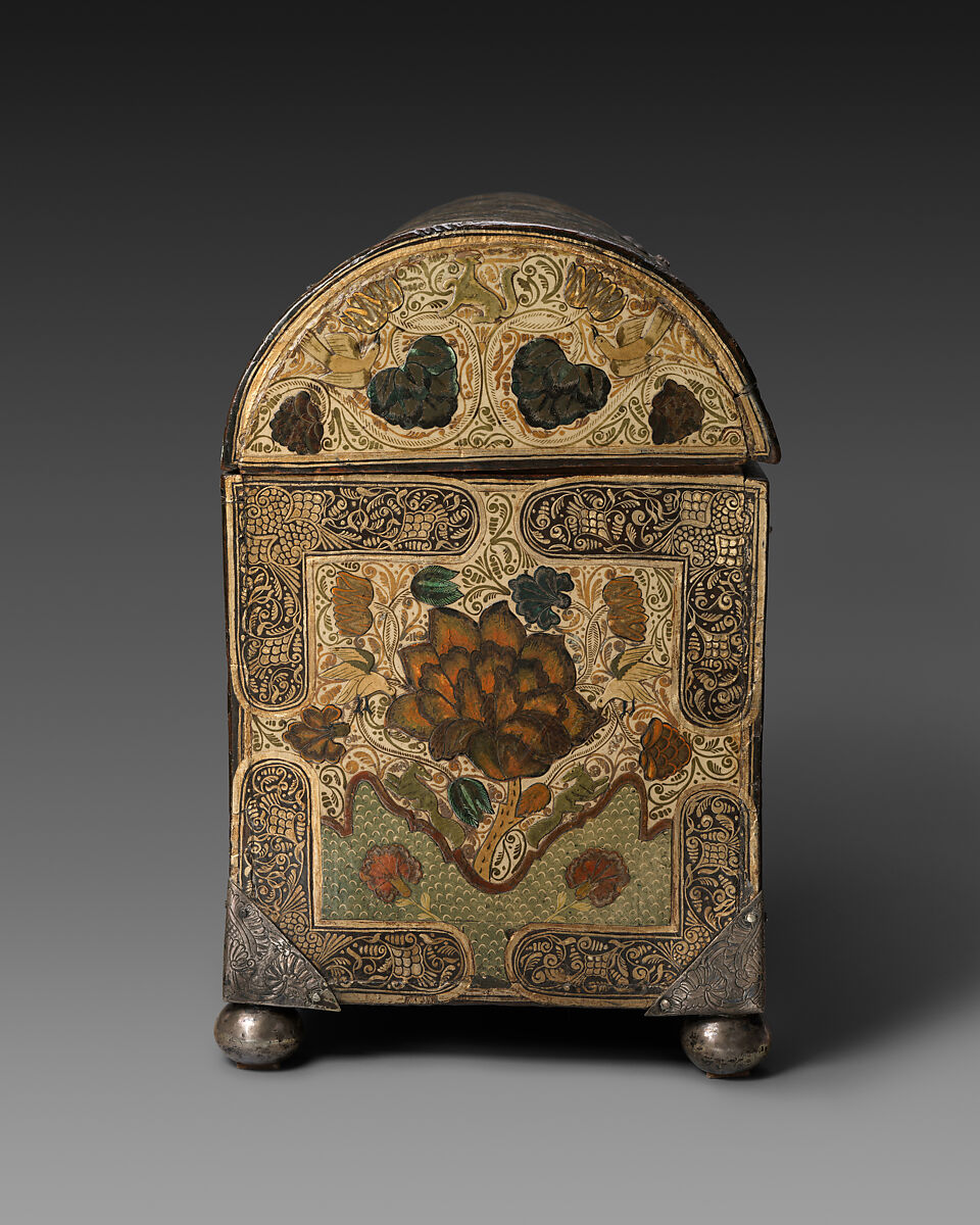 The dazzling surface of this chest was created using a technique known as barniz de Pasto (Pasto varnish). Translucent resin, extracted by chewing the leaf buds of a tree native to the northern Andes, was stretched thin, cut, and layered to produce a dense pattern of floral, foliate, heraldic, and animal motifs. The prevalence of native fauna, including parrots, jaguars, monkeys, and armadillos, may reference claims that located the earthly Paradise in South America.