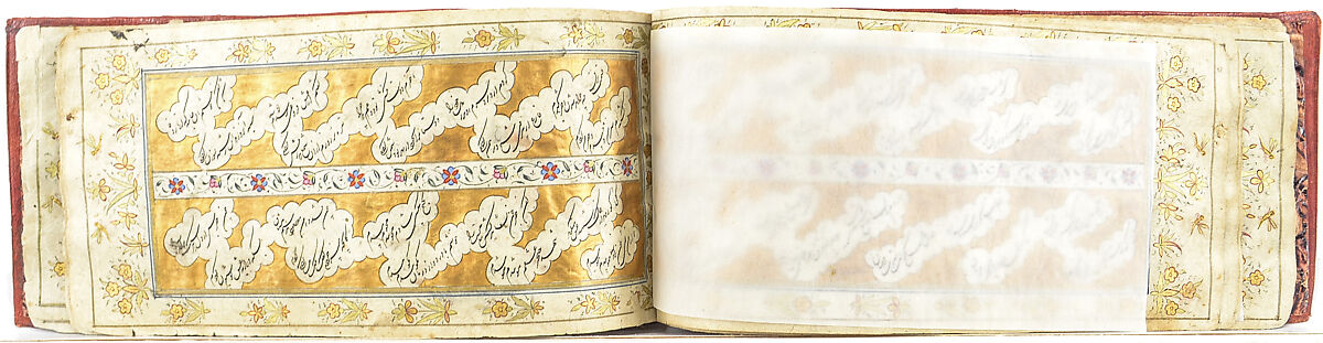 This oblong manuscript bound on the short side is referred to as a safina (the Arabic and Persian word for ship). It is an anthology of love poetry in shikasta (broken) script in which the verses are set into cloud-shaped cartouches and set against a background of shimmering gold. Poetic anthologies in this format demonstrate the continuation of a literary tradition that originated in Iran and Central Asia in the 15th century and proliferated from the 16th century onward.