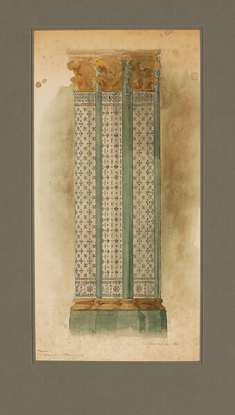 This drawing is a detailed architectural design for a larger interior design scheme. Another drawing in the Museum’s collection was recently identified as a rendering for the interior of the First Presbyterian Church in Poughkeepsie, New York (now the Redeemed Christian Fellowship Church of God of Prophecy). The clustered columns seen in this drawing supported mosaic spandrels and were repeated four times around the central space. The decoration is documented to Tiffany through period newspapers that include glowing descriptions of the interior, noting in particular the mosaic-decorated columns. The columns bring to mind the mosaic-decorated columns that Tiffany designed and made for the firm’s impressive installation of a complete chapel at the World’s Columbian Exposition in Chicago of 1893. The drawing of the mosaic columns also relates to the Museum’s own Tiffany mosaic column with a gilded capital on view in the Charles Engelhard Court. The original Tiffany-designed interiors of the church are largely destroyed, and the drawing is important evidence to document what the original interiors were like when they were enthusiastically praised by the New York Times in the spring of 1908.