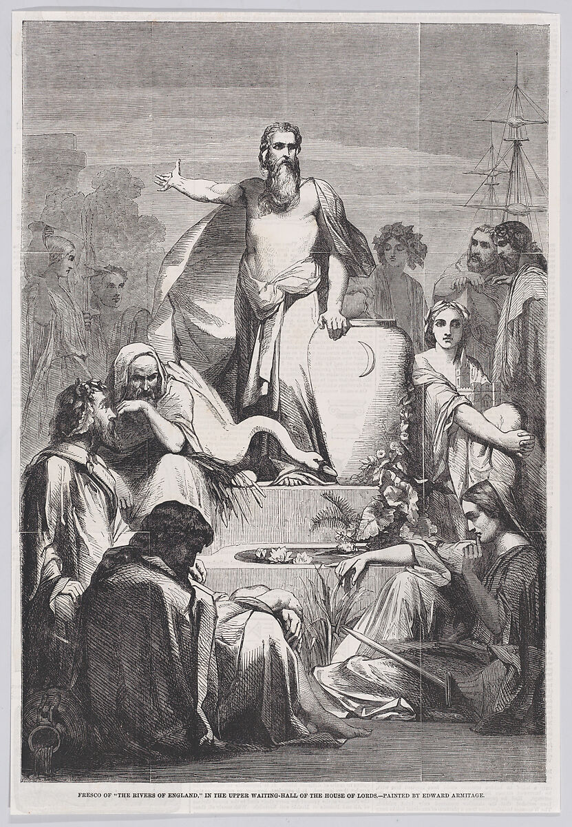 This image is inspired by Alexander Pope's "Windsor Forest" which names tributaries of the Thames. Father Thames stands next to a stone jar, surrounded from upper left, by the Wandle (a woman holding a pitcher), the Kennet (a youth holding a trident), the Thame (a man resting his head on a hand), the Lee (a man with weed in his hair), the Mole (a man in shadow), the Darent (a woman with a finger to her lips), the Isis (a woman holding a small church), the Colne (a bearded man crowned with leaves), the Wey (a cloaked man leaning on a post), and the Loddon (a youth with leaves around his head). The print reproduces, in reverse, a fresco that Armitage painted in the Upper Waiting Hall of the new House of Lords. Fresco had been little used in England for public buildings but was here encouraged by Prince Albert. The damp climage caused the frescoes to decay and they were concealed by 1894, but have recently been conserved.