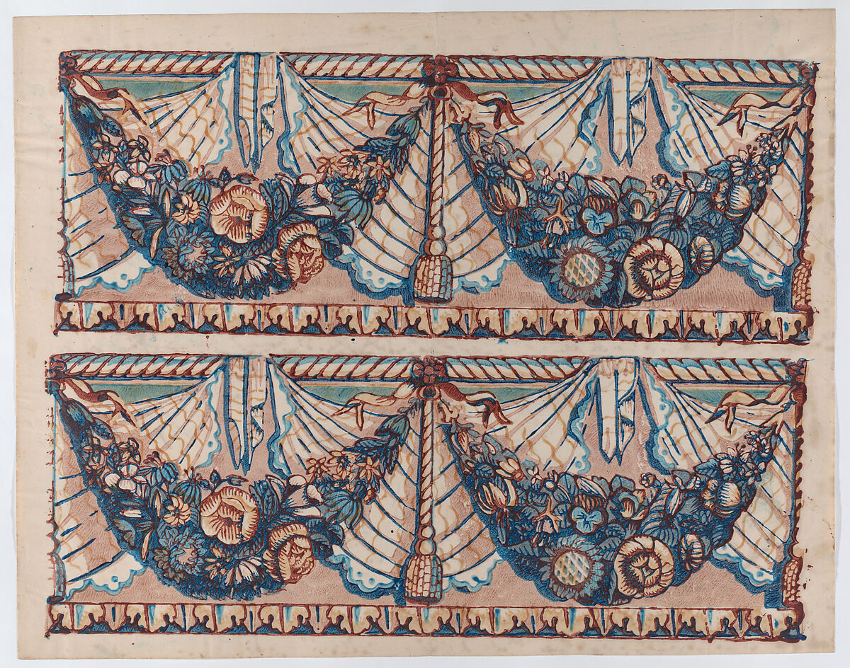 - Title:Sheet with a two borders with hanging drapery and two blue floral garlands