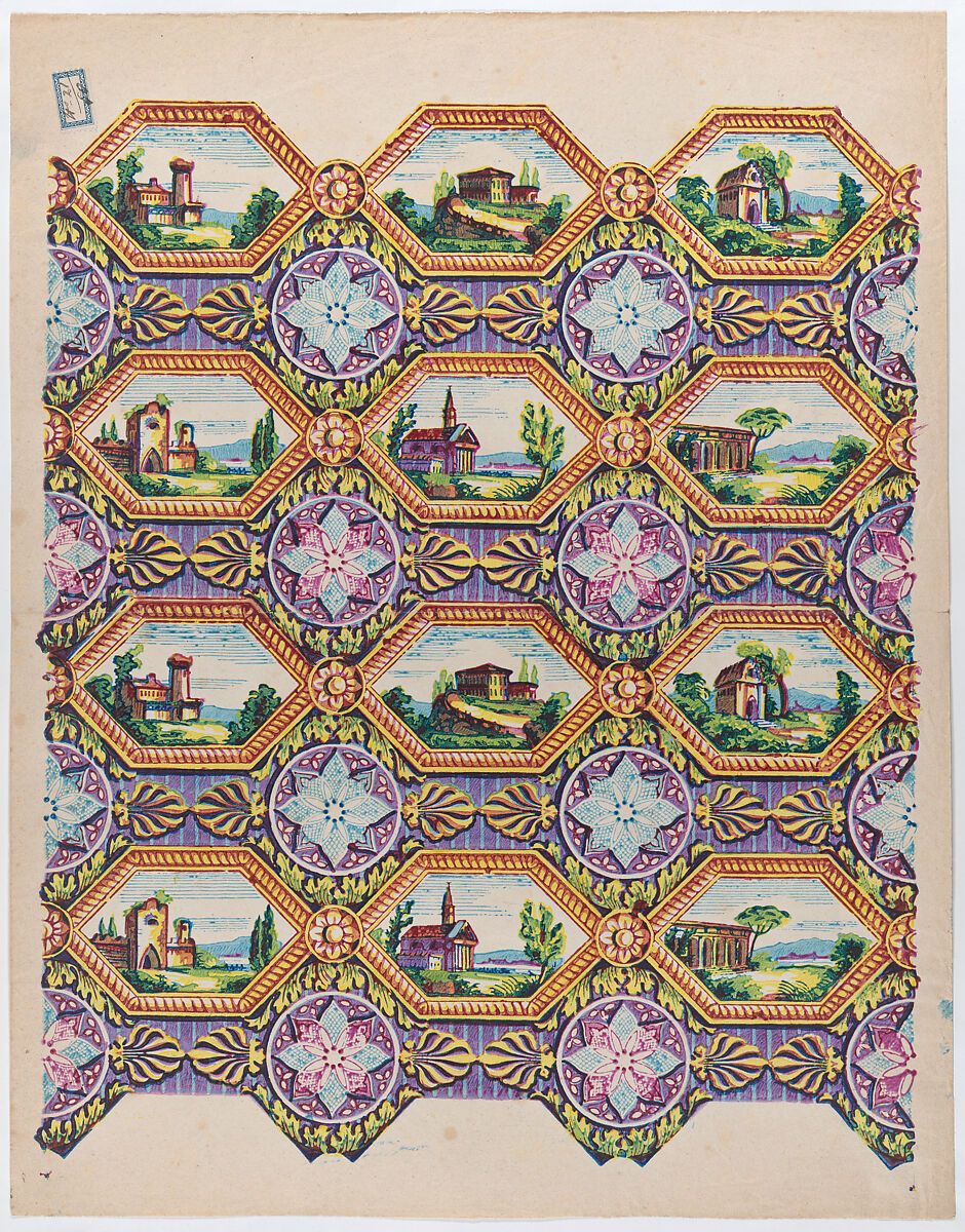 - Title: Sheet with pattern of brightly colored landscapes in hexagonal frames
