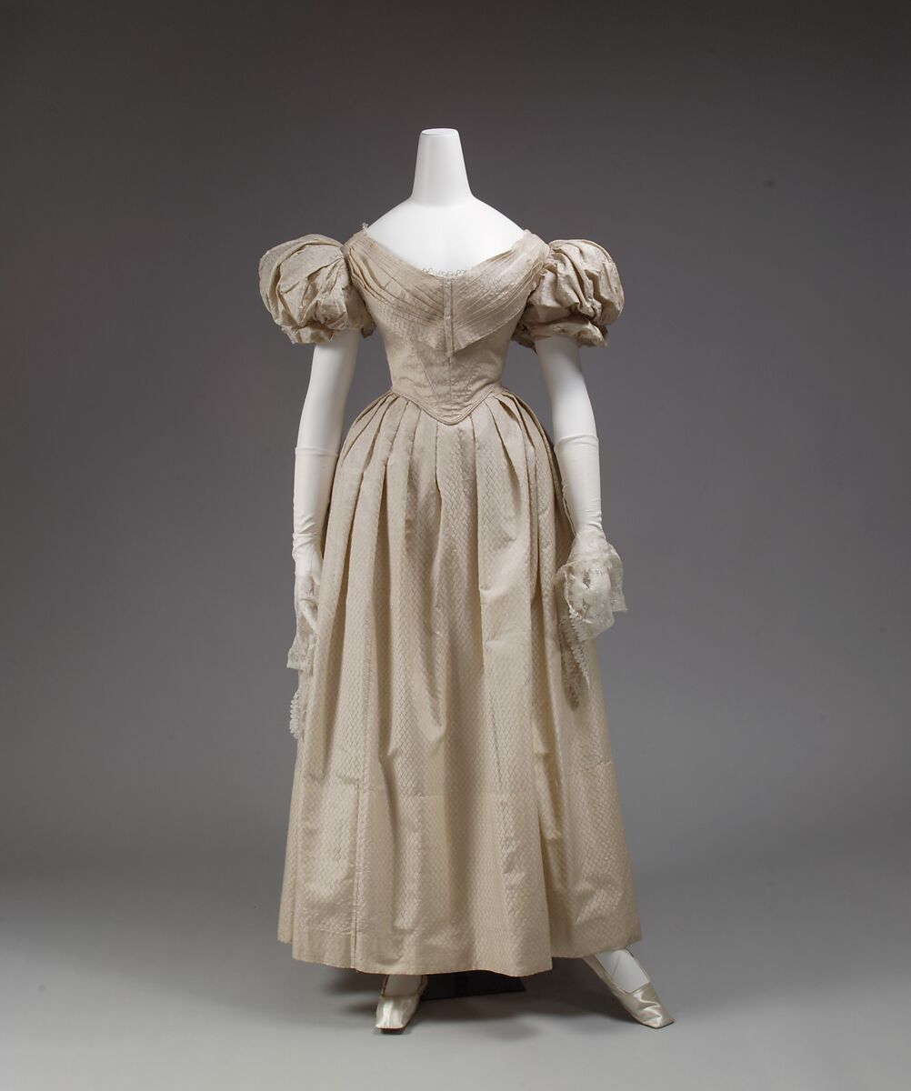 Caricaturists of the 1830s focused on the newly fashionable inflated forms that were such a contrast to the body-revealing styles of the previous three decades. The dilation of sleeves and skirts reached such an extreme that women were often satirically depicted as airborne, caught up by gusts of wind trapped under their skirts. In fact, they were weighed down by the sleeve pillows and multiple petticoats required to support their stylish volume.