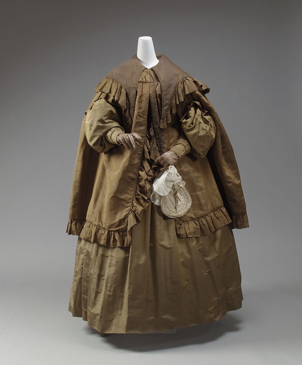 The inflated sleeves of the mid-1830s, once expanded to their fullest capacity, collapsed and contracted by 1837. This dress is a typical example of this new shape with its sleeves narrowed and gathered at the shoulder. Here, however, it is shown with its coordinated cape, since the survival of a complete, matching ensemble from this date is highly unusual. The desired overall effect was of a bell-shape which the cape, with its triangulated shoulder, emphasized.