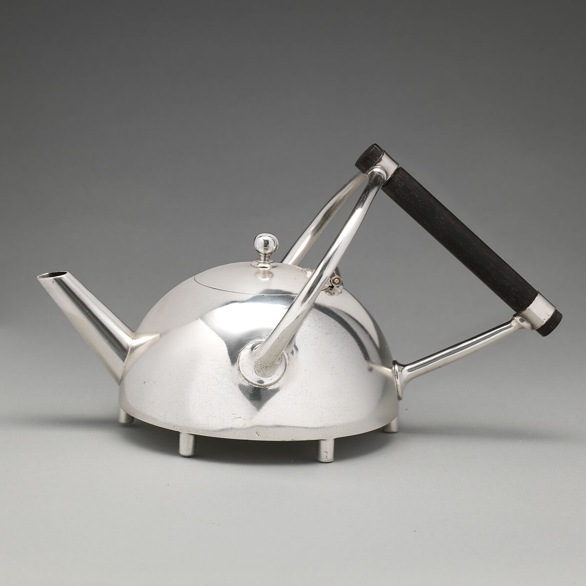 This teapot was produced by the Sheffield firm of Dixon and Sons, founded around 1808, to a design by Christopher Dresser. The versatile Dresser sold thirty-seven designs to the firm between 1879 and 1882, but not all of them materialized. Highly unusual designs, such as that of this teapot, afforded Dresser the appreciation as a proto-modernist. However, they also departed from Dresser’s own set of rules regarding the cost-effective production and employment of expensive materials.