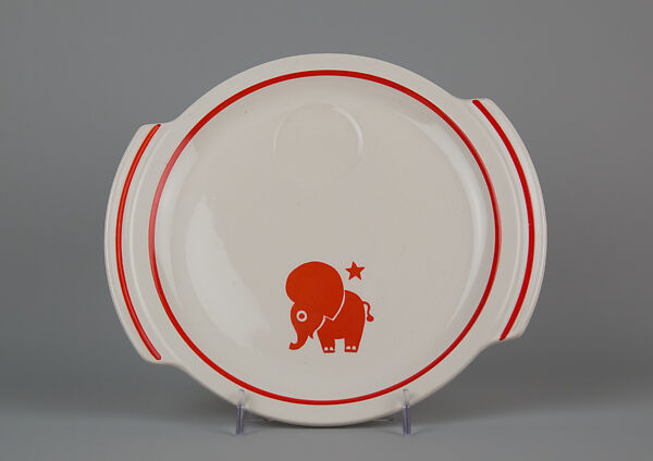 Viktor Schreckengost was a most prolific and influential industrial designer, who enjoyed a long career during the 20th century. He was literally born into the ceramics industry, in Sebring, Ohio, where his father worked at a ceramics factory. Schreckengost studied at the highly influential Cleveland School (now the Cleveland Institute of Art), graduating in 1929, and launching into a successful career, both designing and teaching. By the mid-1930s Schreckengost had already established his fame as a ceramic sculptor. He also worked as a designer in the tableware industry, and by that time had begun designing it in a modernist mode, providing designs for both the forms and the decoration. One of his most successful, was his “Manhattan” shape, with its rounded, ample, simple, and spare forms, with unornamented rims. Its very name, “Manhattan,” implies modern, urban life. The shape was conceived as a vehicle for transfer-printed decoration, allowing for new designs to be issued annually. In about 1935 the American Limoges China Company (later Sebring Pottery), where he serve as artistic director, introduced his Animal Kingdom line on “Manhattan” forms. It features various simplified animal motifs—humorous stylized designs of elephants, donkeys, pigs, squirrels, and fish, each accompanied by a carefully placed star. The designs were not hand-decorated, but rather were applied with decals. In many ways the chubby and cheerful silhouettes in vibrant colors are almost childishly naïve.