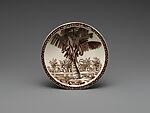 The modernist artist was among those involved in promoting a nationalistic spirit, stemming in part from his efforts against the spread of fascism in Europe. His concern with promoting American ideals extended to designs he provided in the late 1930s for three different sets of dinnerware, all produced by the California pottery of Vernon Kiln. For Kent and others, this was also another way of democratizing his art. Many artists were gravitating to printmaking, as a way of making their art more accessible to the public, especially middle- class consumers. While the designs for his other two services were based on his book illustrations, those he executed for Our America were created afresh. His stark wood-cuts were adapted to transfers on china, to be printed in three monochrome hues—blue, mahogany, and brown. The service depicts American scenes ranging geographically from the metropolis of Manhattan to the Great Lakes to the Florida everglades to the West Coast. A number of the scenes represent laborers at work, championing Kent’s nationalistic beliefs in the America of the common man, the workers who made this country. Kent's reverence for the diversity of the American landscape and for "the working man" shines through the decoration. The star-spangled borders are wholly consistent with the patriotic theme.
