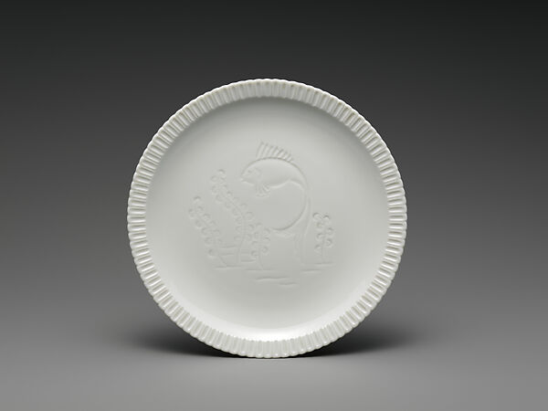 This plate is part of one of the most elegant American Art Deco dinnerware sets to appear on the market—the Shelledge line made by the Onondaga Pottery Company of Syracuse China. It was designed by R. Guy Cowan, who in 1931 assumed the position of art director at the well-established Syracuse firm. The forms are clean-lined versions of traditional tableware, but the boldly fluted edges offer a strong, mechanistic quality. At the center of each pure white porcelain plate are intaglio designs of flowers, fruit, and tropical fish that are conventionalized into Art Deco geometric elements. These decorative schemes reflect the French modern style of the mid 1920s—which in America saw vibrant expression in architectural decoration, such as on New York City’s Chanin building. While the Art Deco style is generally synonymous with a distinctive, bright palette, here it is colorless and only subtly perceptible. In contrast to the majority of the new wave of American modern dinnerware of the 1930s, which was of a more informal character and was usually produced in heavier earthenware, here the white porcelain emphasizes the stateliness of the serving pieces and the set’s overall formal qualities.
