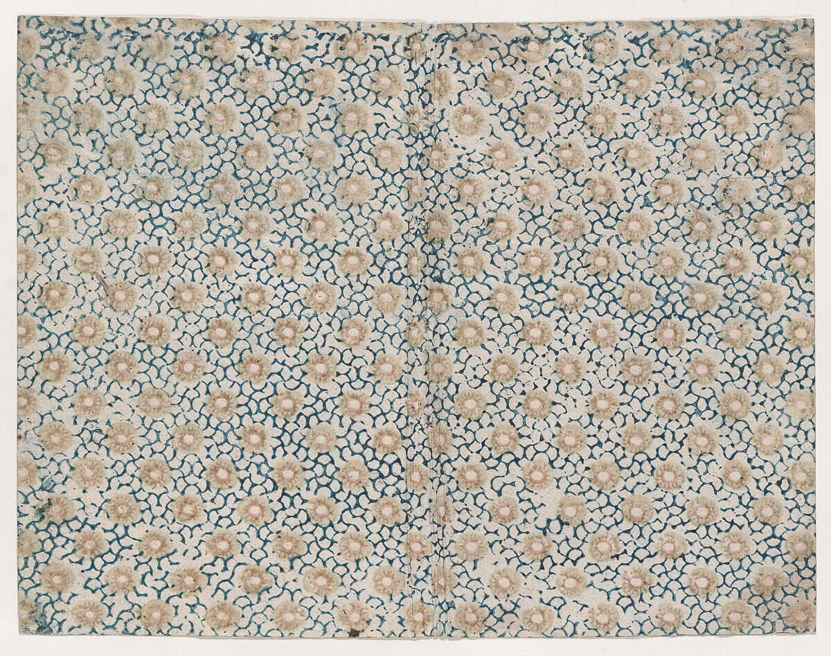 - Title:Book cover with yellow floral pattern atop blue curved lines