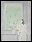 Enomoto Chikatoshi established himself as one of the great twentieth-century advocates of Nihonga, a school that uses traditional media to portray startling images of modern life as well as historical figures. His paintings of “modern girls” (moga), like this example, show young women dressed in the latest Western-inspired fashions of the day or wearing stylish accessories. Created when Japan was expanding its empire overseas and on the eve of the outbreak of World War II in Europe, the painting attracted attention when it was featured in the prestigious Shin-Bunten (Ministry of Education) national exhibition in 1939. The artist effected a complex interplay of framing and directed gazing; we observe the subject of the painting as she observes the fish, which we may imagine are eyeing her.