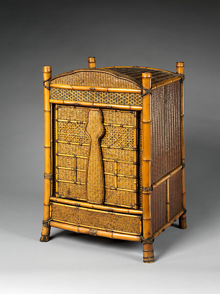 Iizuka Hōsai II often created bamboo works in the shape of objects that would traditionally have been made in other media. Meant to be used as a portable shrine, this cabinet takes the form of an oi, the characteristic backpack of mountain monks and pilgrims. Hōsai substituted tightly plaited bamboo for the basic structure and the central bottle-shaped slat, which holds the cabinet doors in place, and he created the other sections in various plaiting patterns. When open, the doors display depictions of Hanshan and Shide, semilegendary eccentric Chan Buddhist monks active in the eighth century at Guoqingsi, a temple on China’s sacred Mount Tiantai.