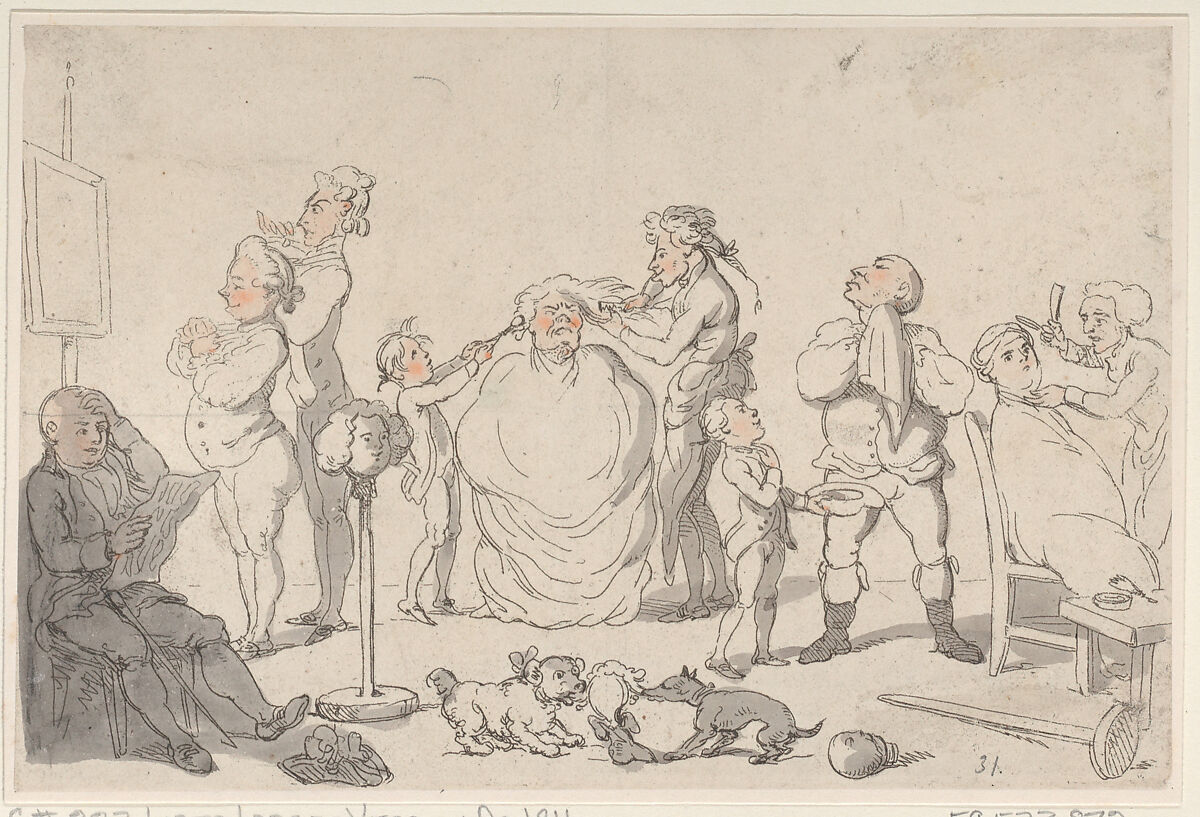 A large man sits at center covered with a cloth, having his hair dressed by a barber and a boy. Another customer at right wears a cap and is covered by a cloth as he is shaved. A third figure, just released from the attentions of the barber, dabs at his neck, directed by a boy. At far left, a tall thin man and short portly man both look in a mirror and tie their neckcloths. Near them a seated bald man looks up from his paper in concern as two dogs fight over his wig which has fallen from a stand.