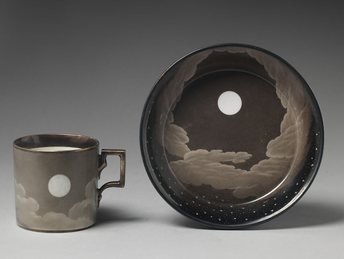 The night sky, though a key motif of German Romantic poetry and painting, is rarely seen on Continental porcelain of the early nineteenth century. The stark black sky, bright stars, and shining moon contrast with the gilding and ornate classical motifs seen on more typical porcelain pieces of the period. In the late eighteenth century, the moon became a source of fascination for German poets, who explored themes of yearning, solitude, and despair.