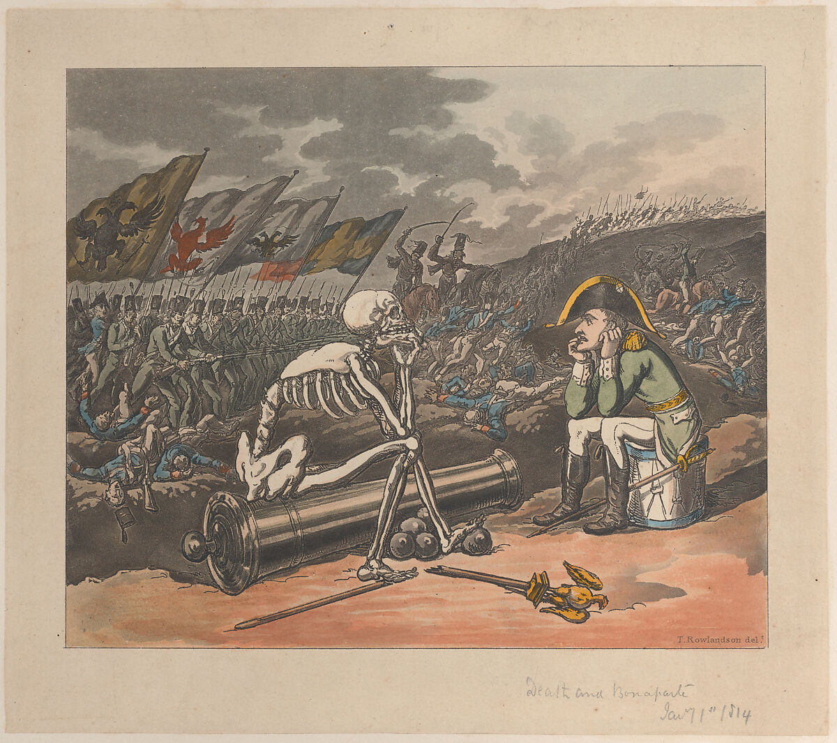 A skeleton, Death, is seated on a cannon at left, and Napoleon is seated on a drum at right. Behind them is a symbolic representation of the "Battle of the Nations." The print was first used at the top of a printed broadside, "Copy of the Transparency Exhibited at Ackermann's Repository of Arts, During the Illuminations of the 5th and 6th of November 1813, in honor of the splendid victories obtained by the Allies over the Armies of France, at Leipsic and its environs." This is a reissue.