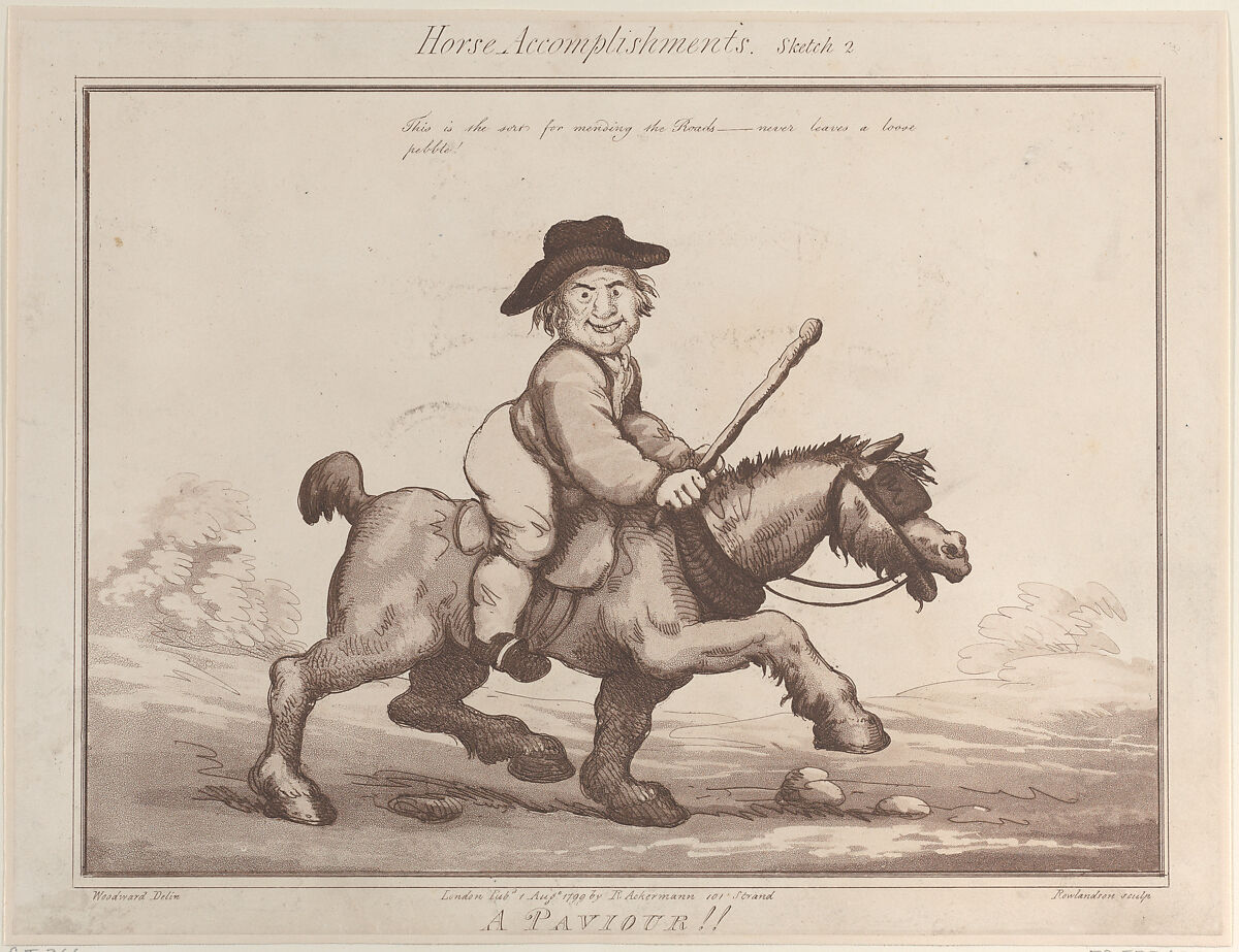 One of a set of twelve prints that make fun of different sorts of mounts. Here, a man rides on horseback to the right, carrying a cudgel, his horse blinkered. Text within image above reads: "This is the sort for mending the roads–Never leaves a loose pebble!"