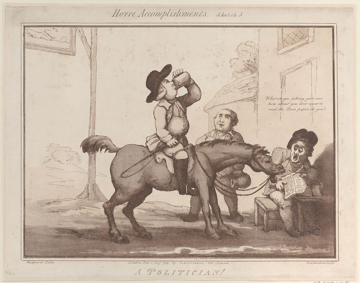 One of a set of twelve prints that make fun of different sorts of mounts. Here, a man on horseback has stopped outside a tavern and holds a drink while his mount leans down towards the newspaper of another man seated at a table. Text above reads: "What are you poking your nose here about you don't want to read the News paper do you?"