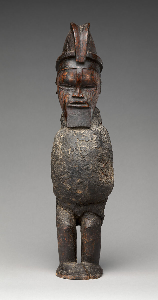 With its masterful carving, complete ritual encasement, and historical provenance, this classic Teke Nkiba fills an important gap in the Met's collection. The male figure depicted here represents a powerful ancestor (inkwii). Master sculptors would have sold such small-scale works in the marketplace, fashioning larger scale works for the benefit of an entire community on commission. By empowering and activating a figure representing an ancestor through the addition of bonga (powerful medicinal matter), a link between the living and the dead is formed, ensuring the peaceful functioning of society.