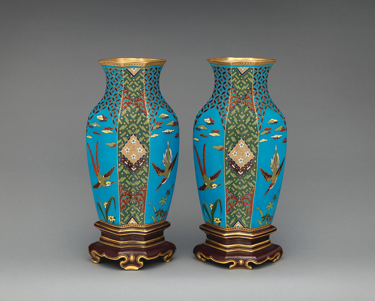The shape of these vases copies that of a Japanese bronze, and the decoration is drawn from both Chinese and Japanese sources. The painted motifs on these vases are executed in a style intended to resemble cloisonné enamels in which the colored enamels are outlined in gold. These vases reflect one aspect of Dresser’s deep interest in Japanese art, which informed his work in regard to both shapes and decorative schemes.