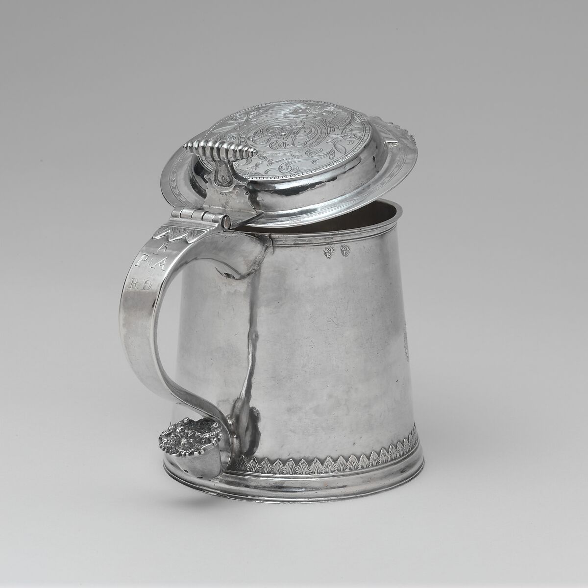 The smooth, flat covers of early New York tankards were ideal venues for decorative engraving. Here, period ornament surrounds an interlaced monogram of the script initials “JD” for the original owner, Jonas Douw (ca. 1655-1736). The tankard’s body is engraved with a cartouche of leafy mantling surrounding the coat of arms and crest used by the Douw family. The tankard’s provenance is remarkably complete, and its successive owners include some of Albany’s best-known colonial families. Jonas’s son Petrus Douw (1692-1775) married Anna van Rensselaer (1696-1756) in October 1717, thereby uniting the Douws with one of Albany’s most prosperous families. The initials of Petrus and Anna are engraved on the handle of the tankard.