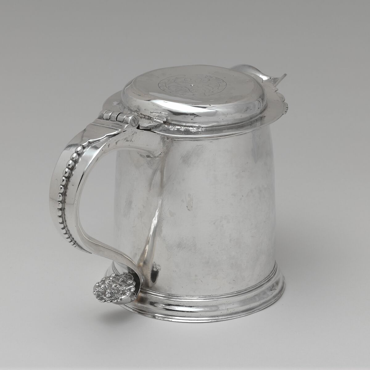 This tankard was made for Severyn Bruyn who died in 1759 and bequeathed it to his grandson Severyn Bruyn the second. This Severyn was an officer with the donor's grandfather in the War of 1812. As the two became older and retired from active life, the donor recalls that they used to sit and drink from the tankard "copious spiced New England rum and compared notes upon the way in which they had licked the British . . . When the great temperance agitation of 1830 came along, they drank milk punch and a strainer and spout were added to the face of the tankard in order to strain the grated nutmeg and other solids in the making of the punch. I know that they all regarded the strainer and the spout as a profanation, but in those days, as in these, the women of the household ruled the roost and to please them the strainer and the spout were added."