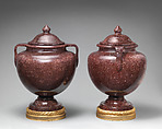 The ‘timeless’ Neo-Classical design of this fine pair of spherical Imperial porphyry urns makes their dating particularly difficult. They are likely to have been produced between 1770 and 1820 and could have been acquired by a grand tourist to Italy around that time. While earlier, more elaborately designed urns gave the carver the opportunity to display their artistic virtuosity, this plainer example puts the emphasis on the mesmerizing color of the porphyry stone. This particular example shows variations of light pink and black speckles.