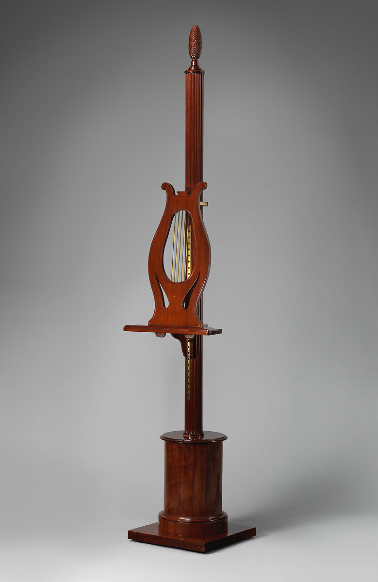 The lyre-shaped backrest suggests that this piece of furniture may have been used as a music stand. The use of mahogany and the severe neoclassical style suggests a date of circa 1800.