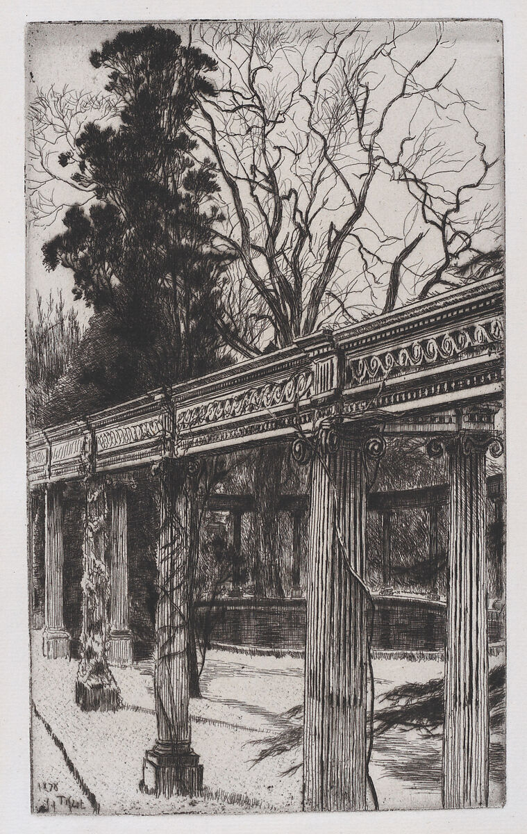 Inspired by a similar structure in the Parc Monceau in Paris, Tissot installed a cast-iron colonnade in his London garden. He employed it frequently as an architectural setting in his paintings and prints. Here, void of figures, it features as the primary motif—a rare pure landscape within Tissot’s oeuvre. The artist included an impression of this etching in his exhibition at the Grosvenor Gallery in 1879, suggesting that he was particularly satisfied with the print and considered it an independent work.