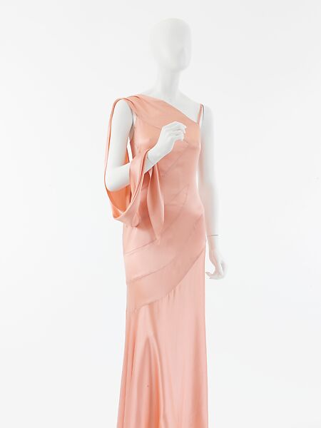 The dateless quality of Chanel's satin dresses resides in her abiding recognition of the female form. Typically, she employed spiral, arced and crisscross piecing as structural and decorative devices that sensuously aligned with the curvatures of the body. In several versions from the 1930s, arcing planes of satin sweep around the body like a gyroscope. To punctuate the sleek, streamlined sensuality of the designs, Chanel often employed self-fabric flowers, usually her beloved camellias or gardenias. Self-tie bows, a detail she introduced in the 1920s, highlight discrete zones of the body, such as the neck or hips, providing further animation.