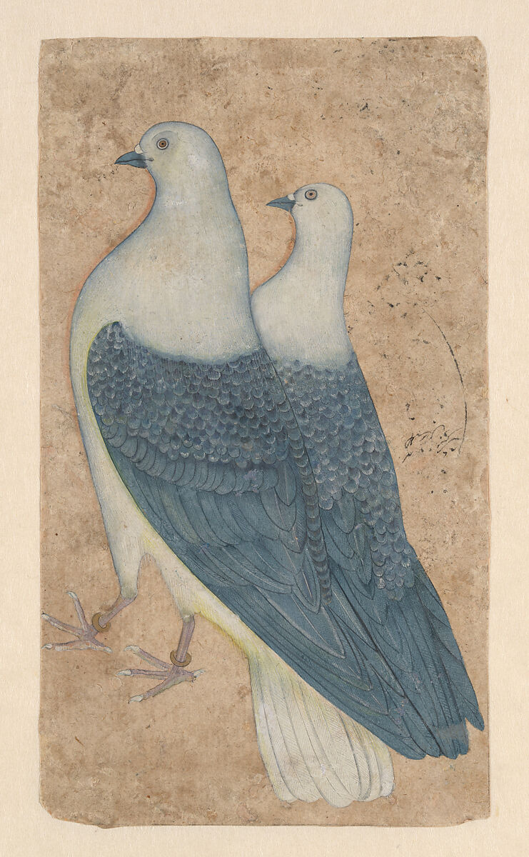 This painting of Two Pigeons is a detailed depiction of the natural world of India in the seventeenth century. Mughal emperors were particularly fond of paintings depicting their world, including portraiture, historical events, and documentation of flora and fauna. This painting fits into a much larger category of plant and animal studies, and records the species present at the Mughal court. The pigeon at left has two golden anklets on its feet, suggesting that these are imperial creatures in the possession of the Emperor.