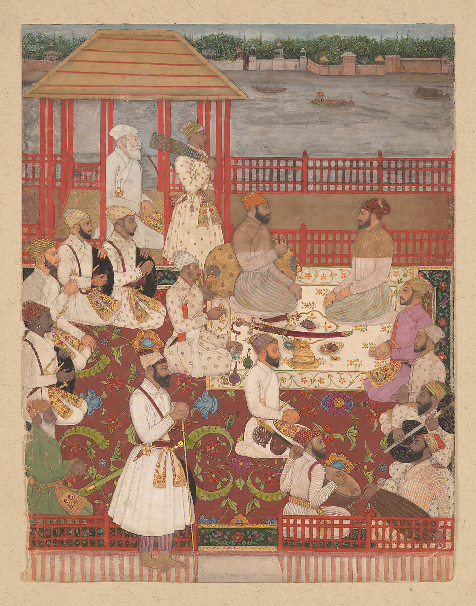 Court culture in India reflected modes of life and patronage that extended from the visual to the musical. The court was an important center of all such developments, drawing talents from around the country and beyond, and evolving a life style that allowed for the enjoyment and appreciation of the arts unified with environment and setting. Artists excelled at capturing the nuance of this courtly splendor, sensitively conveying the talents of their musical compatriots and the advanced appreciation of their common patron, the ruler. In this scene, a musical party is hosted by the nobleman depicted at the center of the scene, leaning against a large bolster, entertaining a guest who sits directly across from him. A row of attendants are seated behind the host, while a group of musicians are playing stringed instruments and drums at lower right.