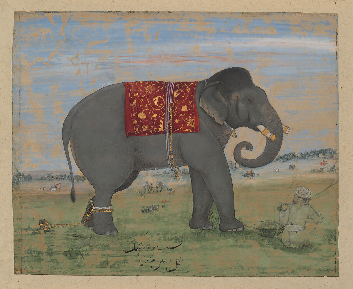 This splendid image of an imperial elephant shows the animal tethered in open grassland, close to a Mughal army encampment. He waits patiently as his keeper strips cane and prepares other greens for his meal. Tiny groups of foot soldiers and cavalry may be seen in the distance as well as elephants, camels and a noblewoman’s purdah carriage drawn by bullocks. The now flaked inscription below the image has the impression of being written by emperor Shah Jahan himself and has been speculatively read as giving the name of the elephant as Firuz Jang ("Victorious in war").