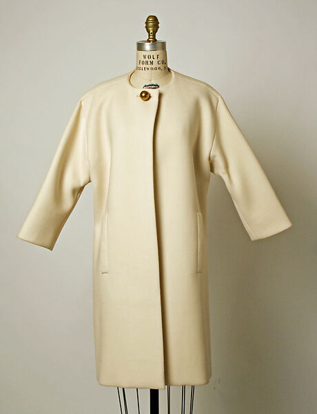 Balenciaga was a designer of some conservatism, closing down his business the same year he made this coat, in part in protest against the debased taste and vulgarity of the time. His last collections are characterized by intensity of color and form. In this, the fashion designer’s equivalent to “The Whiteness of the Whale,” Balenciaga made a colorfield painting, or even a shaped canvas, with the purity of white or cream.