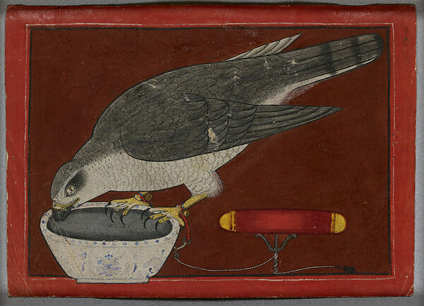 This work of art is currently on loan to the museum.The ancestry of falconry, a sport much favored by Indian rulers, can be traced back to the seminomadic peoples of Central Asia. As expressed in Hindu court painting, this vogue is directly attributable to the fashion established by the Mughal courts. The refined hunting abilities of predatory birds, such as their strength and speed in striking prey, were qualities much admired in the martial culture of the Hindu courts. Rajput and Pahari rulers recorded their most beloved animal—birds of prey as well as elephants and stallions—in paintings, both for enjoyment and to chronicle the accoutrements of their reign.Here, we see a royal trained bird of prey, identifiable as the powerful goshawk (Accipiter gentilis), perched on the rim of a Chinese blue-and-white porcelain bowl, from which he is drinking.