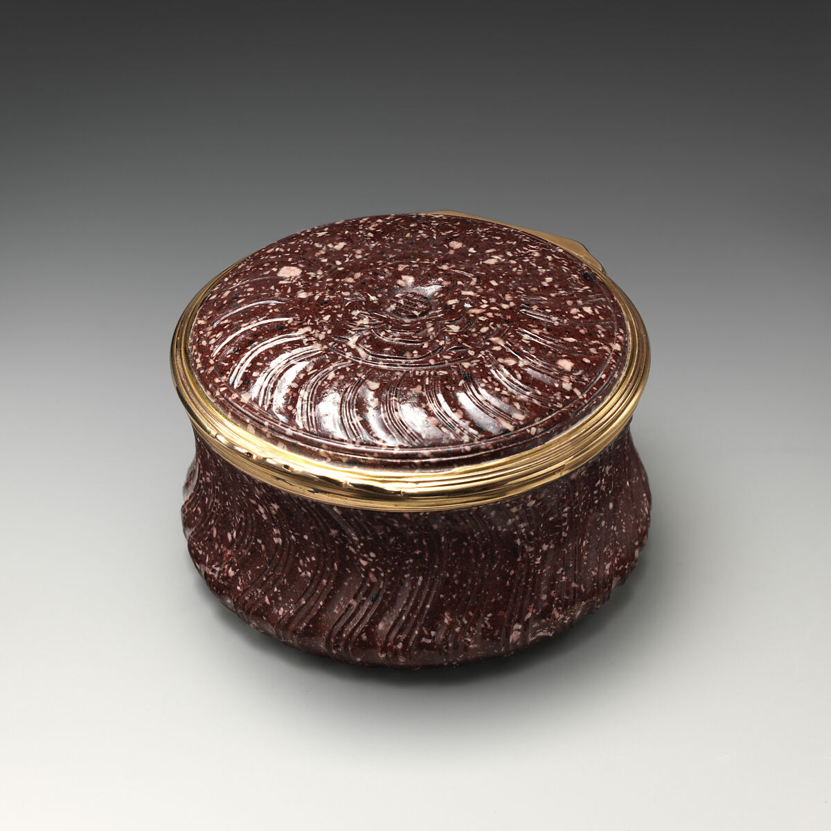 This finely carved circular snuffbox testifies to eighteenth-century appreciation for Egyptian Imperial porphyry. The intricacy of the carving displays an extremely high level of craftsmanship, bearing in mind that porphyry is famous for being a particularly hard stone to work.