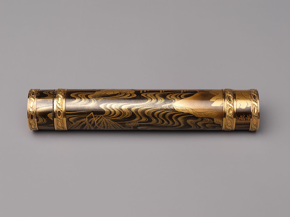 This tube-like message case, intended to hold precious documents, could be attached to a chain and carried as a pendant. A very unusual work, it was created in France using a Japanese lacquer object and French gilded mounts bearing the mark of discharge (décharge) for the city of Paris from about 1768 to 1774. Its maki-e decoration depicts a landscape with a house and rocky shore. As Japanese lacquers were rare and precious in Europe due to limited Western contact with the isolated island country, such objects were often repurposed and refurbished with the addition of expensive gold or gilded mounts, which were thought to enhance their beauty and significantly increased their value.