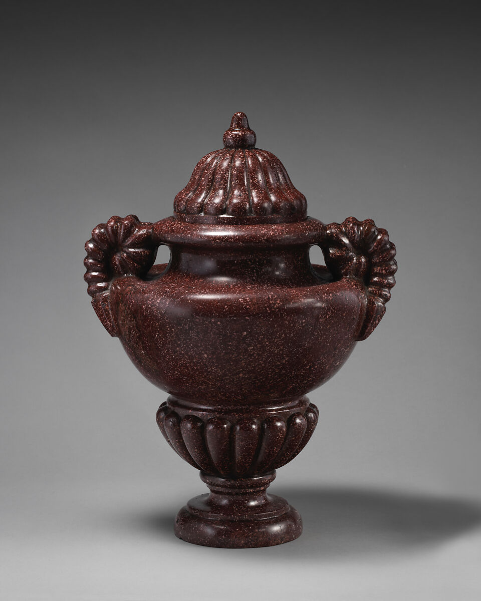 This handsome pair of Baroque porphyry urn with gadrooned lids were probably made in Rome and indeed bear resemblance with a design by the Roman painter and engraver Giovanni Angelo Canini (1609–1666), preserved at the Louvre. The echo of gadrooned lid and lower section of an urn, paired with ram’s horn handles can be found on numerous mid-17th century porphyry vases, including several examples from Cardinal Mazarin’s collection now at the Louvre.