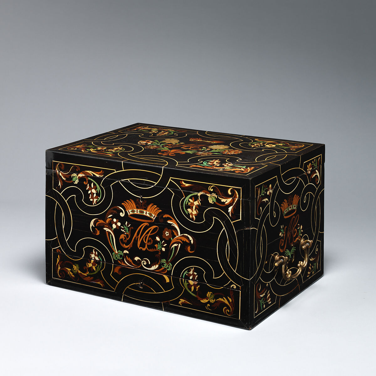 This marquetry coffer shows the Medici ducal coronet and the interlaced initials of Anna Maria Luisa, the last descendant of the main branch of this family. It is possible that this coffer was made for her at the occasion of her 1691 wedding to John William, Elector Palatine of the Rhine in Düsseldorf.