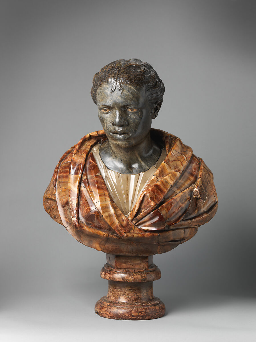 This is one in a pair of polychrome busts produced in emulation of the late work of Nicolas Cordier (1567-1612). Trained in Saint-Mihiel in the workshop of the Richier family, Cordier ("il Franciosino") traveled to Rome in 1592, where he lived and worked until his death in 1612. By 1600, Cordier had garnered significant attention for his talent as a marble carver and restorer of antique sculpture. Between 1607 and 1612, he created a polychrome statue, called Il Moro (Louvre, Paris), using an antique torso as a base, for Scipione Borghese, the Cardinal Nephew of Pope Paul V. The black marble head of Cordier’s figure was evidently modeled after a bust of an African Man now in the Museo Nazionale Romano, tentatively dated to the second century CE.