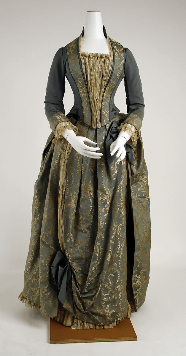 The full-blown revival of eighteenth-century dress, textile, and accessories in the 1880s is evident in the opulence and surfeit of details and shaping of this dress with a label from "L. R. Hollander & Co., Boston." Machine-made decoration allowed the 1880s to surpass the quantities of eighteenth-century ornament.