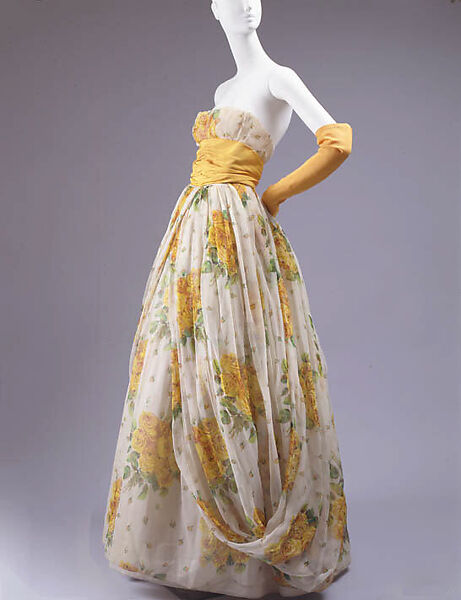 Dior's evocation of the ancien régime is clear in this silhouette. He played on the idea of a polonaise of that era by using an overdress that pulls up to reveal an underskirt. In this case, what actually makes the draping at both sides is an unbroken length of chiffon tacked into the waist at back and falling away into two separate trains, but the impression is that of the grand court shape. The overall pattern abets the evocation of a rococo design.